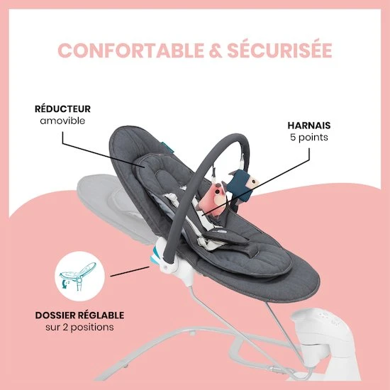 - Très confortable, la balancelle est équipée d’un réducteur pour nouveau-né.