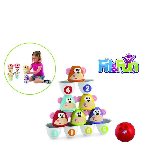 6 quilles colorées et numérotées à la tête de petit singe.