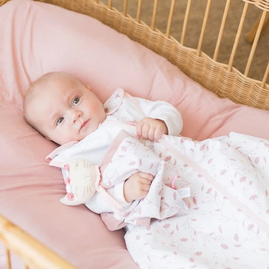 Doudou Rose, format mouchoir avec un jeu des matières entre le coton bio fleuri, le velours vieux rose et son joli petit minois en lin ornée d’une couronne de fleurs. Petit plus : il est doté d’un coin de dentition pour soulager bébé lors des poussées dentaires.