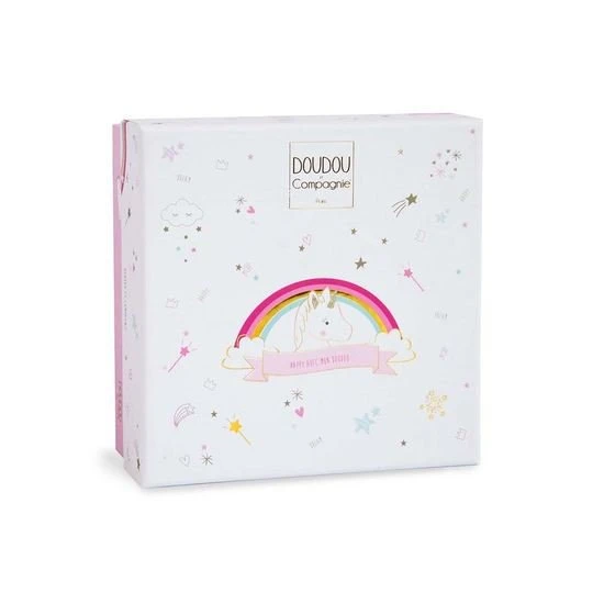 Doudou Licorne, féerique pour faire briller les yeux de toutes les petites princesses et faire de doux rêves à paillettes. Crée dans des matières très douces blanches et roses, il est adorable avec ses touches de glitter or et sa broderie arc en ciel. Présenté dans une jolie boîte au graphisme raffiné et girly, c’est le cadeau idéal dès la naissance. Lavable à 30°.