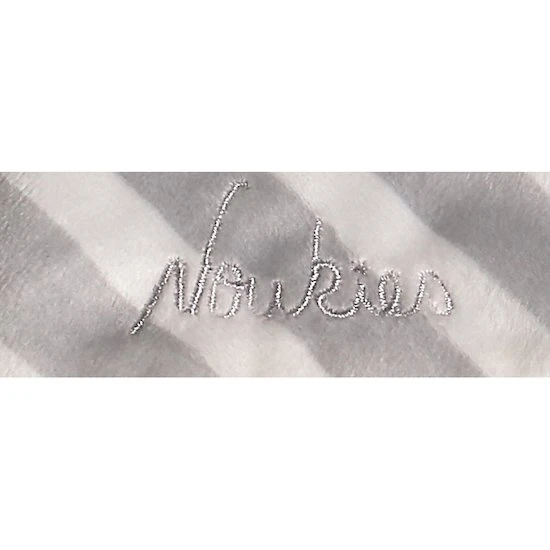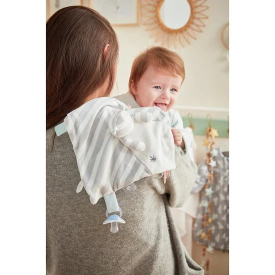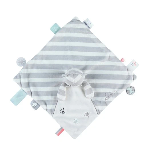 Grâce à son attache en velcro, le tidou Milo en Veloudoux® rayé et vert pâle de la collection Anna & Milo s’attache facilement à la manche du pyjama Noukie’s ou à la sucette.Noukie’s y a ajouté des étiquettes colorées, de matières et de tailles différentes pour stimuler l’éveil des sens de bébé en toute sécurité.