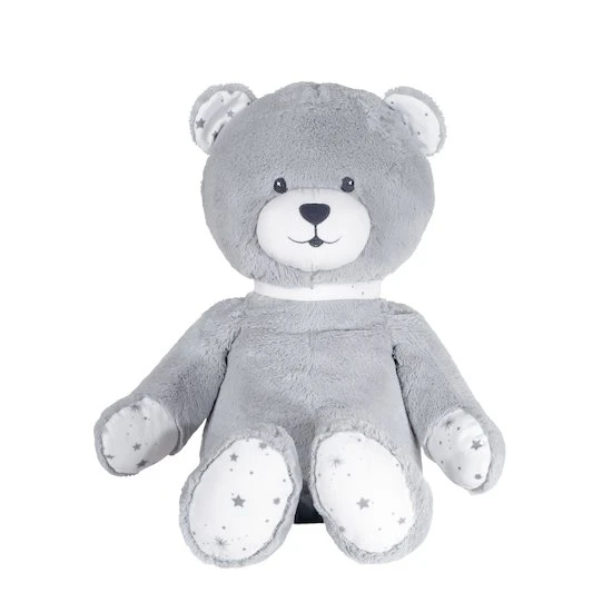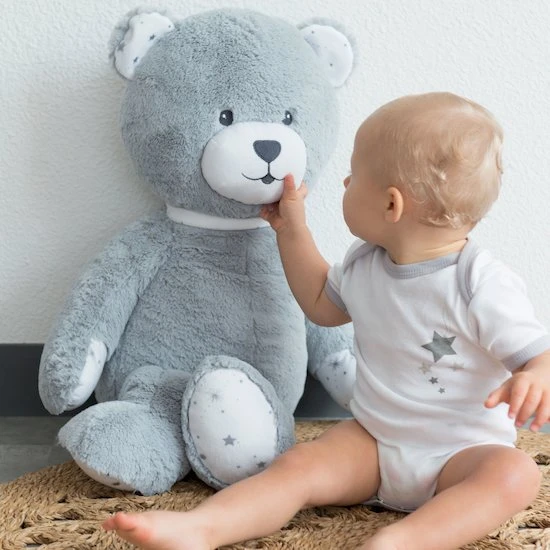 Cette grande peluche bébé N’ours en forme d’ours de dimensions 70 cm deviendra le meilleur compagnon de bébé. Bi-matières, elle éveillera le sens du toucher chez votre nourrisson. Elle est en velours ultra doux gris uni et en popeline de coton blanche avec des imprimés étoiles.