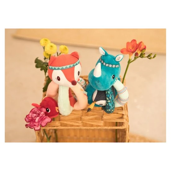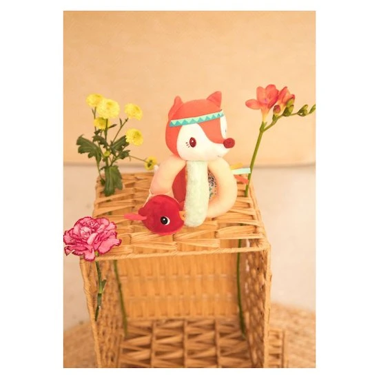 Un hochet original, que les petites mains saisissent facilement. Un petit ami se cache entre les poignées.