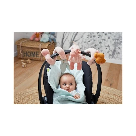 La spirale d’activités ludique Lola rose se fixe facilement au parc, siège auto groupe 0 ou encore poussette grâce à sa forme particulière.