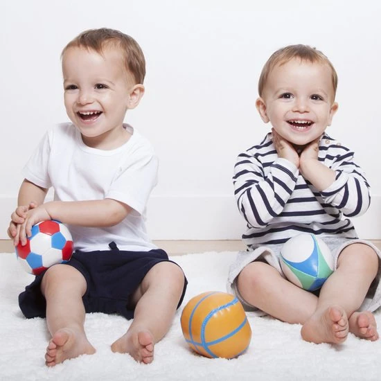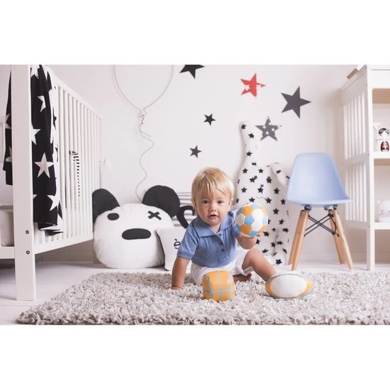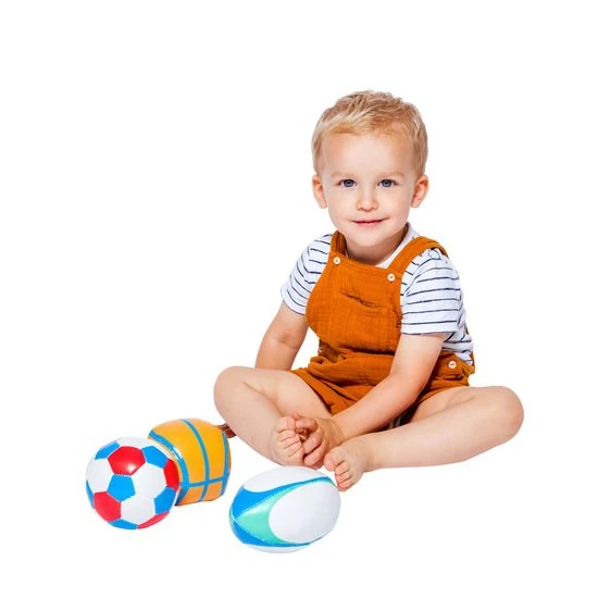 Ce set comporte trois mini-ballons de sport : foot, rugby et basket, pour des moments de jeux partagés.