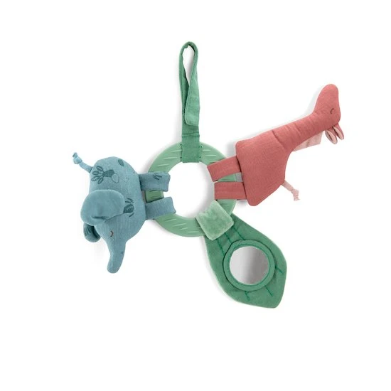 L’anneau aux couleurs de la savane comporte un pouët caché dans le ventre de Bergamote l’éléphant, un grelot dans celui de Bibiscus la girafe, tout plein de surprises à toucher et attraper! Pratique avec le velcro, on peut le suspendre et l’emmener partout.