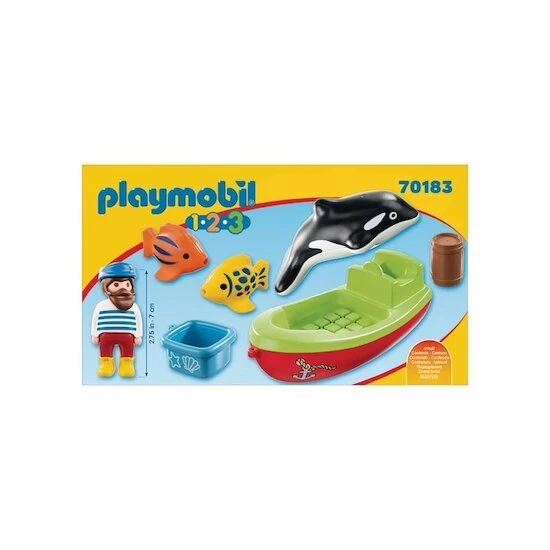 Avec Playmobil 1.2.3, le Bateau et pêcheur, votre enfant imagine et crée ses premières histoires. Le marin à bord de son bateau de pêche observe les poissons et l’orque. Le bateau et les poissons flottent dans l’eau pour devenir des jouets de bain. Et hop ! C’est parti pour l’aventure.