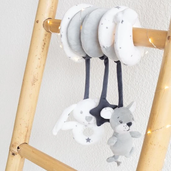 Cette jolie spirale d’activités bébé de la collection Martin et ses copains est en velours ultra doux. Blanche et grise, elle est contrasté d’un gris antracite et d’un imprimée étoiles grises. Elle est dotée de 3 pelcuhes suspendues souris et lapin puis d’une étoile pour éveiller et amuser bébé. Sa forme spirale sera facile à installer sur le cosy, le lit de bébé, le landau ou encore le cosy. Elle est une jolie idée cadeau de naissance pour l’arrivée de bébé.