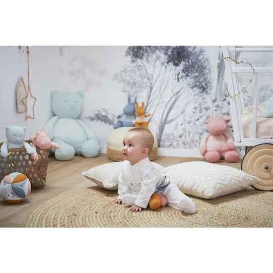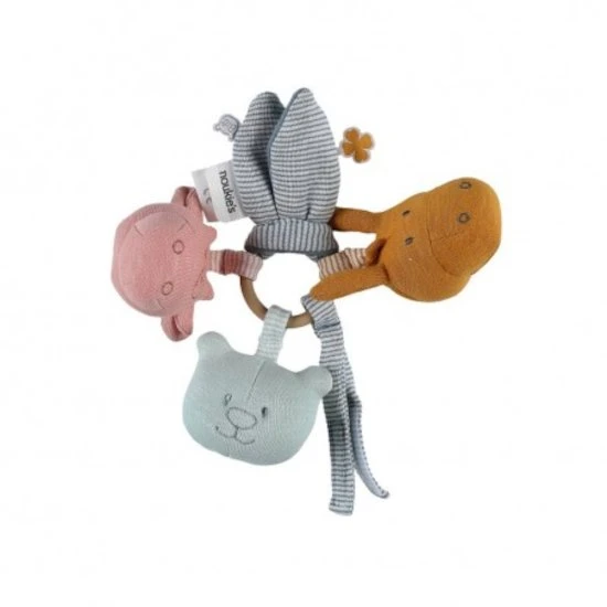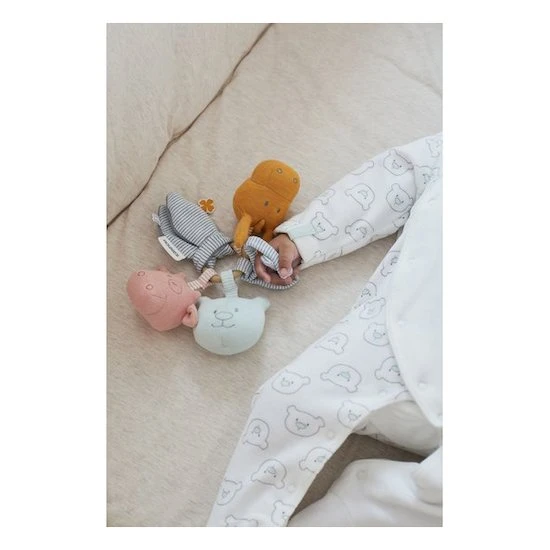 Le trousseau d’activités en coton BIO multicolore de la collection Iconiques propose différentes activités à l’enfant.¶Un hochet en caoutchouc pour faire ses dents, une petite Lola rose avec un pouët intégré, une autre peluche Paco ocre et deux petites formes de feuilles avec du papier froissé dedans, un Nouky aqua avec des billets qui font du bruit.¶Pour éviter de le perdre pendant les longues balades, un anneau d’accroche se trouve à l’extrémité.