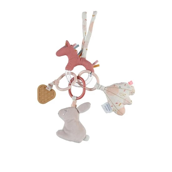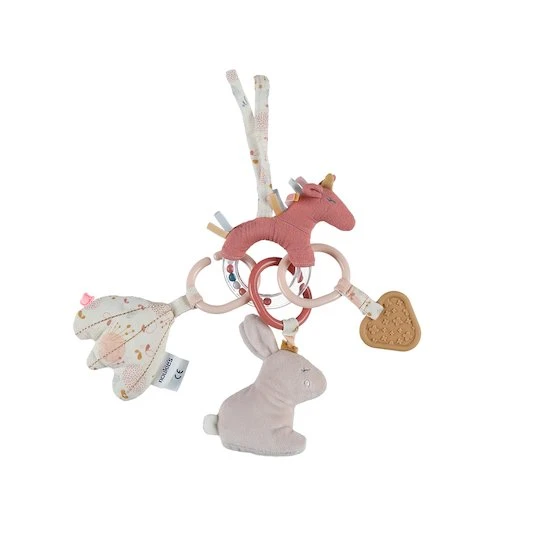 Ce trousseau d’activités en Veloudoux® de la collection Lina & Joy propose différentes activités à l’enfant.Un hochet dont les billes font du bruit en s’entrechoquant, une petite feuille avec un pouët intégré, une autre petite peluche lapin avec du papier froissé dedans.Pour éviter de le perdre pendant les longues balades, un anneau d’accroche se trouve à l’extrémité. Il est possible d’enlever chaque élément afin de les placer ou on le souhaite. Ici, l’enfant est attiré par les couleurs, les motifs différents et les sons.Ce jouet est facile à attraper et à tenir par les petites mains d’enfant.En le manipulant, le bébé développe ses perceptions tactiles, visuelles et sonores.
