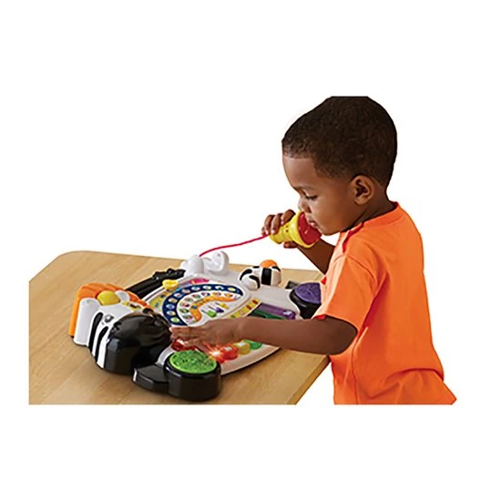 Mon piano Jungle Rock – 1,5 – 5 ansLe zèbre invite l’enfant à jouer avec lui et l’initie à la musique !4 modes de jeu avec un instrument de musique différent à découvrir :- piano- violon- xylophone- saxophone8 touches lumineuses pour découvrir les notes de musique, leur son et composer ses propres morceaux.Un tableau d’activités pour déclencher 10 chansons et 8 mélodies. Les touches de piano s’illuminent une à une pour que l’enfant apprenne à jouer.Un vrai micro pour chanter sur la mélodie comme un petit fou.Un bouton « Concert Jungle Rock » pour entendre le zèbre et ses amis jouer en groupe et chanter tous ensemble et 1 bouton Scratch pour ajouter des effets à la musique.La queue du zèbre déclenche des sons rigolos.13 chansons, 8 mélodies et des sons rigolos d’animaux.Prise en main facile grâce à la poignée de transport, jouet adapté aux enfants dès 18 mois.Réglage du volume sonore.Boîte Try-me.2 piles LR06 fournies.