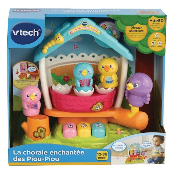 La chorale enchantée des Piou-Piou Trois petits oiseaux musiciens et chanteurs accompagnés de leur maman pour faire chanter et danser Bébé. Ensemble, ils chantent à l’unisson et s’accompagnent à la guitare, à l’accordéon et au tambour.Chaque oisillon est coloré et a son propre instrument. Lorsqu’on insère un oisillon sur la branche d’arbre, il est reconnu et joue un morceau avec son instrument. On apprend également sa couleur.Lorsqu’on place un oisillon dans sa coquille, il se met à chanter. Si on ajoute les autres oisillons au fur et à mesure, ils s’ajoutent à la chanson initiale et chantent en harmonie.Les trois notes du piano interactives et colorées permettent de découvrir de jolies phrases et des sons amusants.Dans leur nid, les oisillons sautillent et font des pirouettes lorsqu’on joue du piano ou bouge la branche sur laquelle est posée leur maman.Deux modes de jeu : un mode Découvertes pour apprendre les couleurs, les chiffres et des anecdotes sur la chorale et un mode Musique pour entendre de jolies mélodies, découvrir les notes de musiques et faire chanter les Piou Piou.2 chansons et 15 mélodies.Boîte try-me. Fonctionne avec 2 piles LR6 incluses.